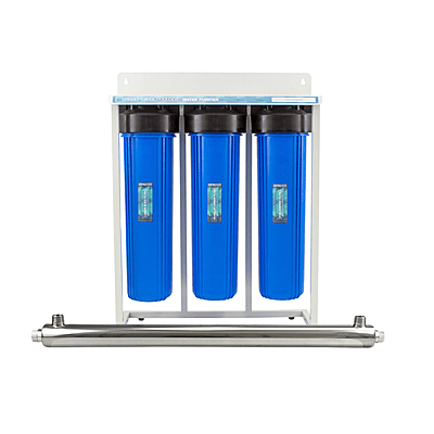 SUPERPURE 3-Stage Big Blue Whole House Water Filter System with 4 Pin UV Steriliser 55W 45L/Min – 1 inch Ports